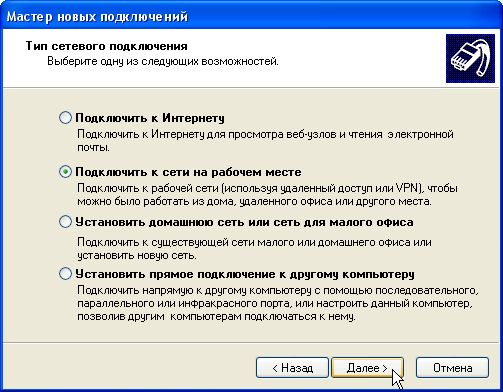 выберите "Подключить к сети на рабочем месте" и нажмите "Далее" (Скриншот №15)